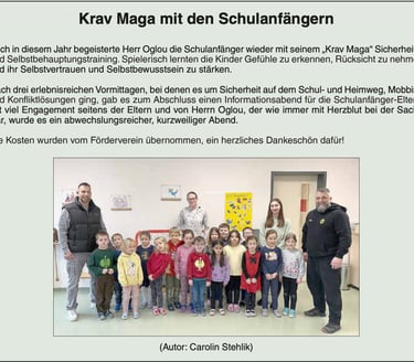 Auch in diesem Jahr begeisterte Herr Oglou die Schulanfänger wieder mit seinem „Krav Maga“ Sicherheitsund Selbstbehauptungstraining. Spielerisch lernten die Kinder Gefühle zu erkennen